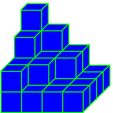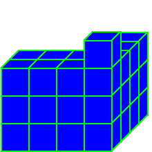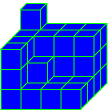 Na obrázcích vidíš zepředu a zezadu to, co zůstalo z velké krychle složené z malých kostiček. Spočítej, kolik kostiček bylo z velké krychle odebráno.