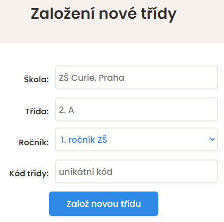 Vyplňte potřebné údaje a zvolte si kód třídy. Ten může být jakýkoliv. Důležité je, aby byl unikátní.