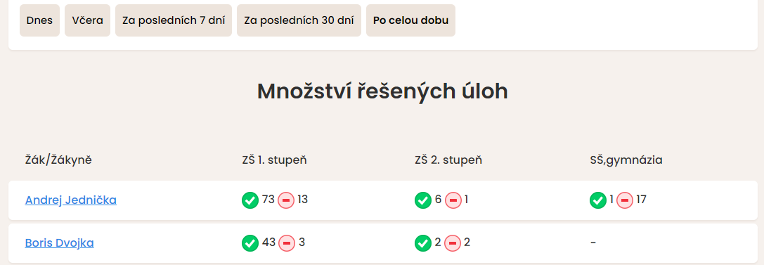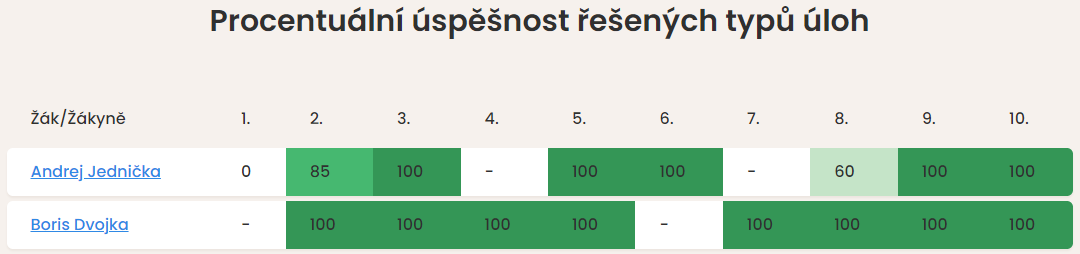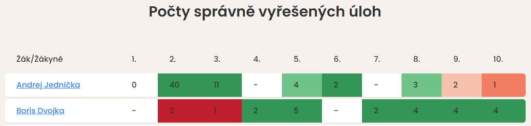 U každého žáka naleznete přehledně graficky zpracované počty vyřešených úkolů. Množství správných řešení je znázorněno spektrem barev od zelené (více správných řešení než ostatní) po červenou (méně správných řešení než ostatní). Znázornění je pouze orientační, teprve po rozkliknutí profilů naleznete úkoly a jejich řešení konkrétním žákem.