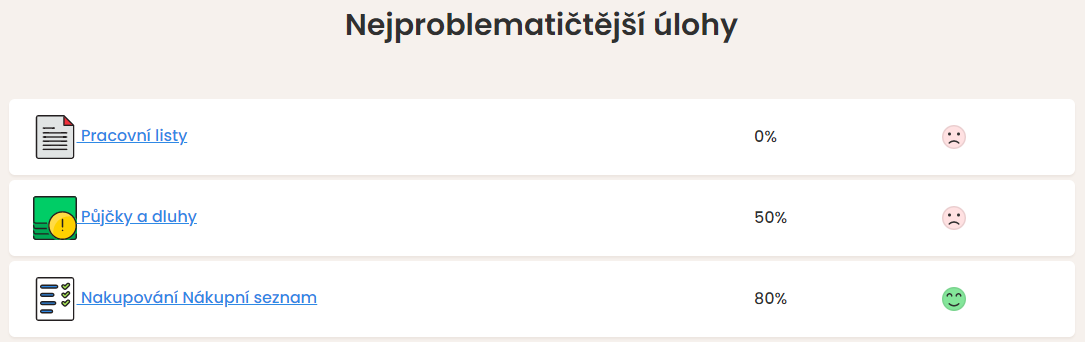 - Statistika, kolik úkolů žák vyřešil správně v rámci jednotlivých typů úkolů