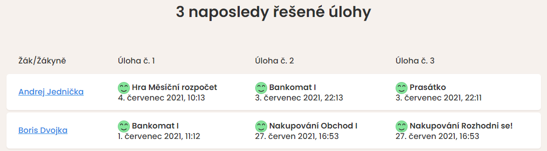 Po každém dalším přihlášení se žákovi automaticky zaznamenávají všechny vyřešené úkoly do jeho profilu.