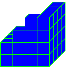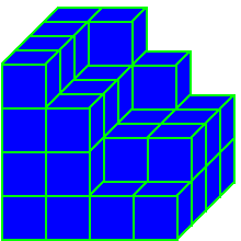 Auf den Bildern siehst Du den Rest eines großen Würfels, der aus vielen kleinen Würfeln besteht. Du siehst einmal die Vorder- und einmal die Hinterseite. Zähle nach, wieviele kleine Würfel aus dem großen Würfel entfernt wurden.